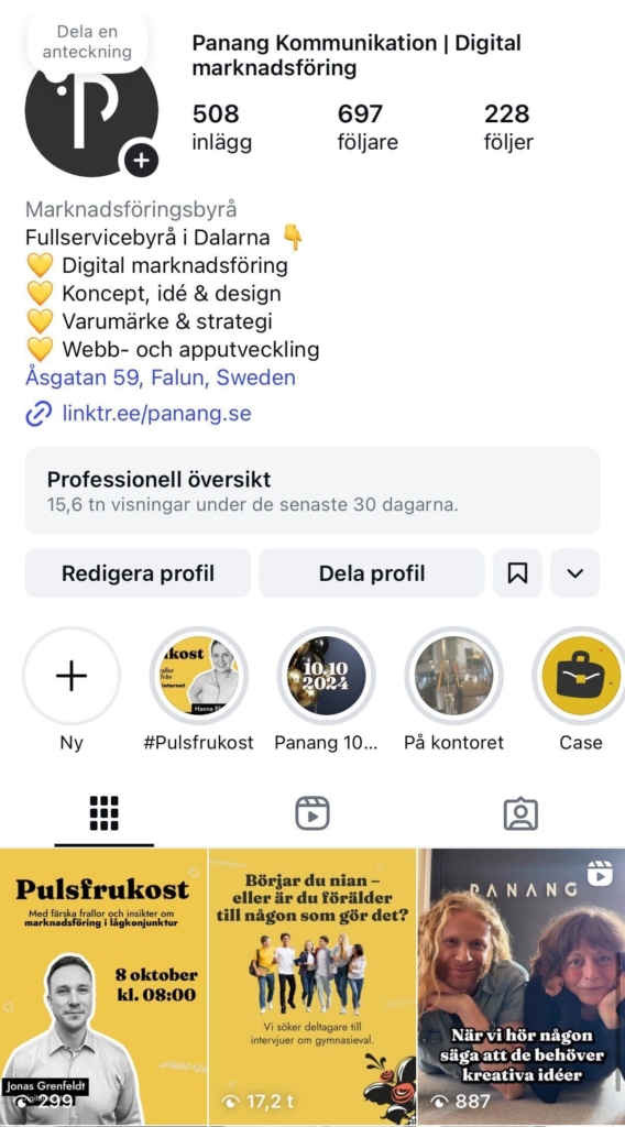 Länken i din profil är guld värd, det är en av få platser där du faktiskt kan skicka vidare trafiken och styra den dit du vill. Den kan till exempel leda till din webbplats eller till ett samlat länkverktyg som Linktree. I vårt Linktree hittar du bland annat våra event, kundcase, tjänster, senaste blogginlägg och kontaktuppgifter.